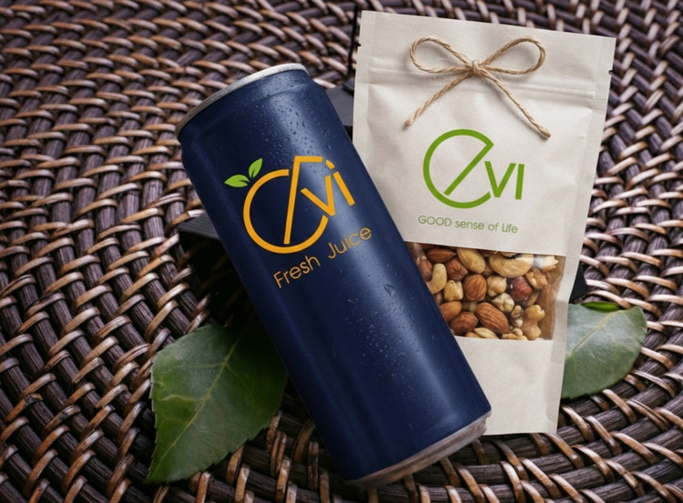 فرم دایرهای لوگو، در کنار تایپوگرافی نام EVI، حس طبیعی و ارگانیک را القا میکند و برای برندهایی در حوزه آجیل، نوشیدنیهای خنک و محصولات سالم انتخابی کاملاً مناسب است.
