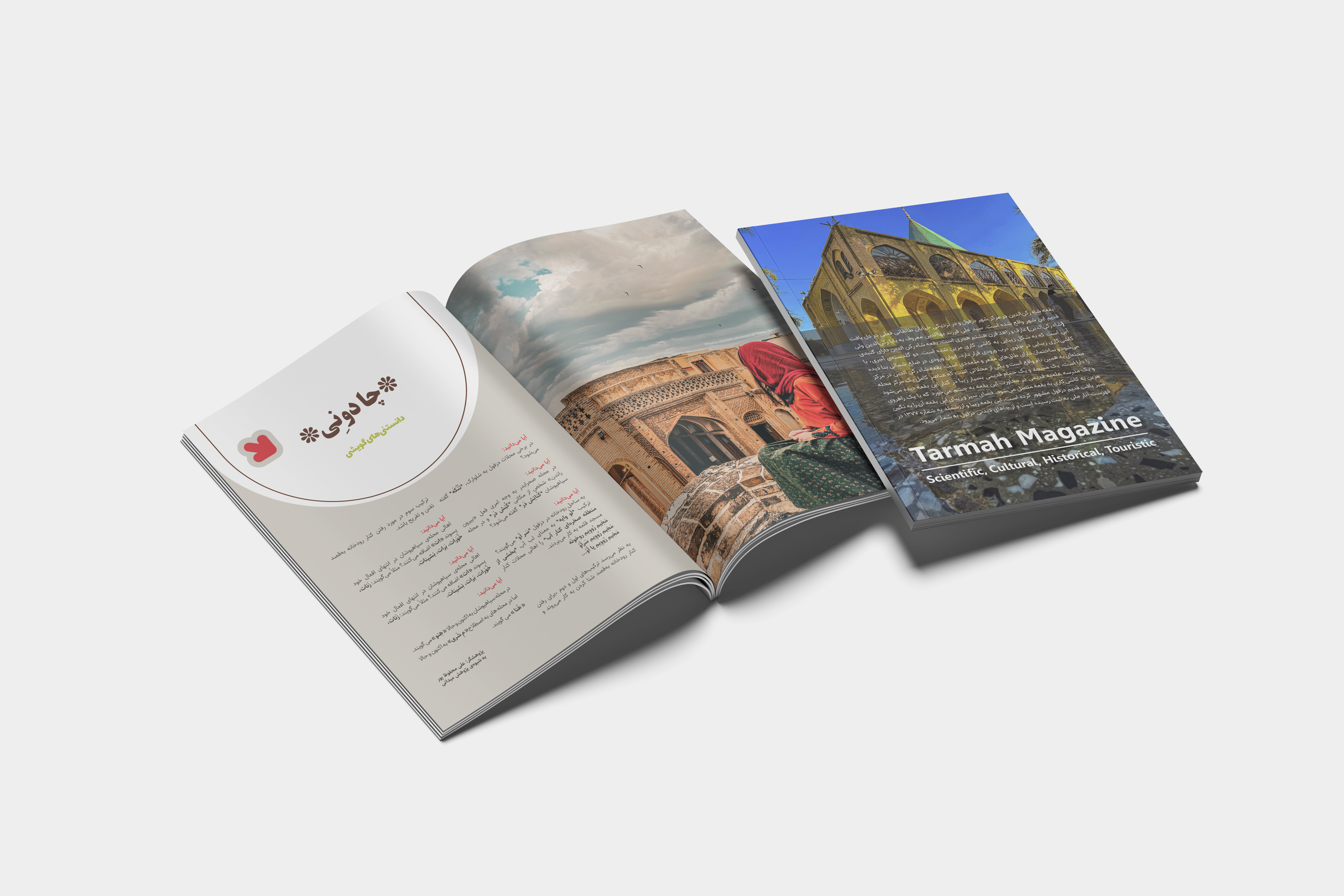 طراحی جلد و صفحهآرایی گاهنامه «تارمه» با محوریت معرفی جاذبههای تاریخی، فرهنگی و گردشگری شهر دزفول توسط مارون گرافیک انجام شده است. در این پروژه تلاش شد هویت بصری نشریه با روح معماری اصیل دزفول، سبک زندگی محلی و رنگمایههای گرم منطقه هماهنگ باشد.